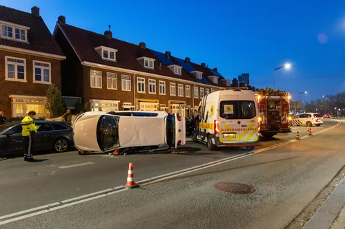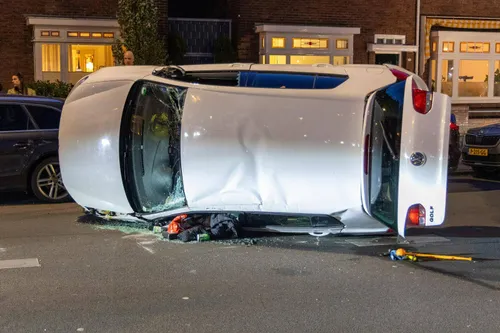Spaarndamseweg in Haarlem een auto gecrasht en op de zijkant beland.