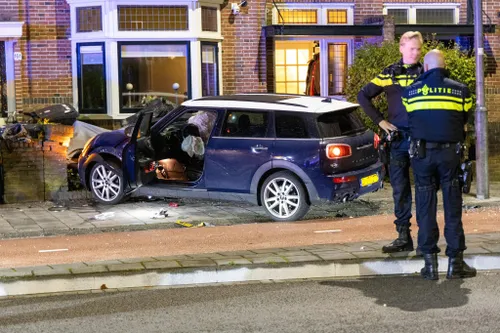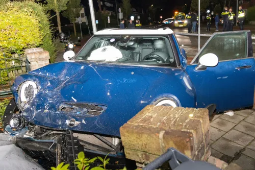rijdende auto schoot de stoep op en kwam tegen een muurtje van een voortuin tot