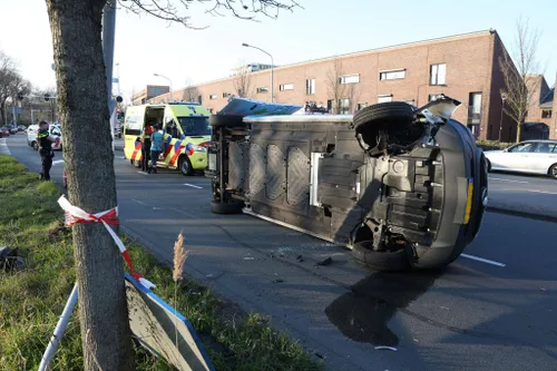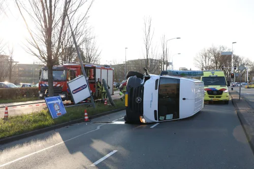 vijf op de Oudeweg in Haarlem is een bestelbus op zijn kant terechtgekomen.