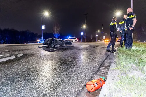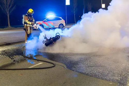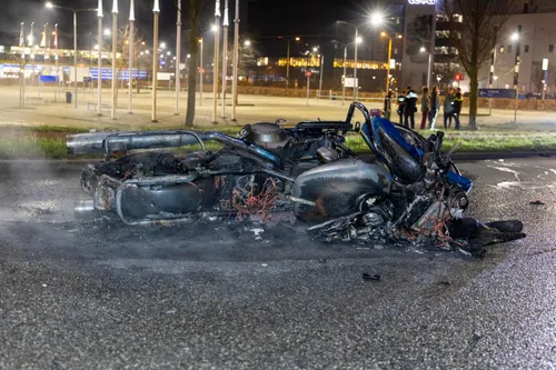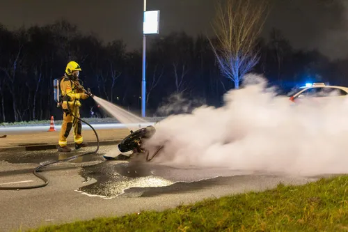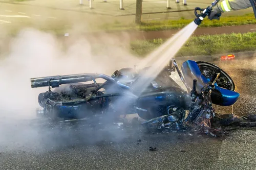 Obscuraweg in Haarlem een motorfiets in brand gevlogen na een ongeluk. Bij het