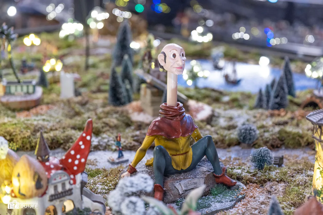 Het moet een enorm werk zijn om zo'n gigantisch Kerstdecor op te bouwen, vorm te geven en -zeker zo belangrijk- ieder jaar weer met een verrassende nieuwe setting te komen. In elk geval helpen bijvoorbeeld de fabrikanten van miniatuur kerstdorpen mee, want ik ontdekte dit jaar zelfs kerstminiaturen van de Efteling. Ik sloeg de plank dus niet mis toen ik sprak over 'sprookjesachtig'. Wellicht bestaan ze al langer hoor die miniatuur Eftelinghuisjes en -figuren, maar ik beleefde zelf dit jaar de premiere! (Hieronder Langnek)