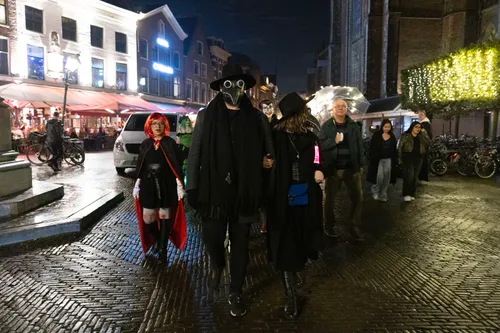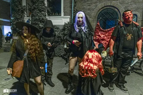 Officieel wordt Halloween 2024 gevierd op donderdag 31 oktober, maar in de Haarlemse binnenstad zorgde een parade van duivels, zombies en meer onheilspellende griezels zaterdag j.l. al voor (ge)donderdag. Dat gedonder begon op de Nieuwe Groenmarkt nabij de Paterskerk, waar geen pater of andere geestelijke zich meer op straat durfde vertonen.