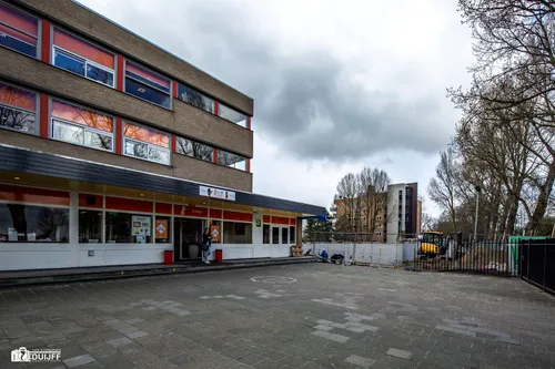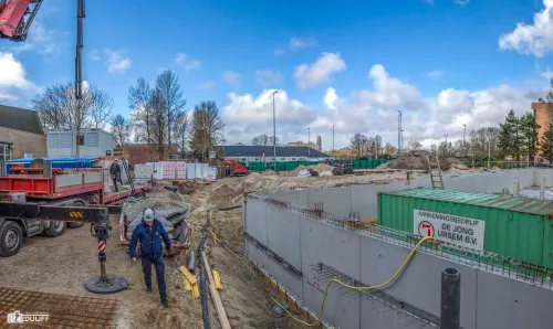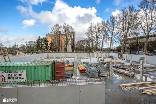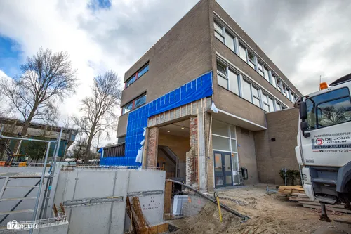 Inmiddels is een aanvang gemaakt met het storten van betonnen wanden en pilaren voor de volgende etage. Op onderstaande foto's is de voortgang te zien.Teneinde de afzonderlijke bouwlocaties goed te kunnen bereiken zijn metalen trappen aangebracht De sporthal wordt verbonden met het schoolcomplex van 'Het Schooter' Hieronder enkele afbeeldingen van 'Het Schoter'