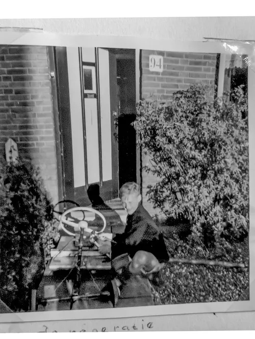 Ik droom (ben nu bijna 78 jaar) steeds vaker terug naar die tijd. Terugdromen naar vroeger doen veel ouderen, zo liet ik me vertellen. Met veel plezier en blij gevoel in mijn geval, want ik maakte een onbezorgde- en liefdevolle jeugd mee, in een straat waar nog nauwelijks auto's kwamen of stonden. De kids uit de buurt waren altijd buiten aan het spelen en dat deed je op de stoep en/of de middenweg. Je liep en rende vele meters per dag, dus aan beweging geen gebrek. Op de foto hieronder sta ik even stil bij een voortuin-hek nabij de familie Woelinga (huisnr 159) en nabij de kruising met de van 't Hoffstraat met de Gibraltarstraat, aan de kant waar later sigarenwinkel annex bibliotheek Parera was gevestigd. Mijn passie voor het zelf maken van een 'zeepkist' (hieronder R) met behulp van een stuur van de auto-sloop en wielen van een oude kinderwagen, verraadt mijn passie voor knutselen. Omdat de wielen regelmatig van het houten frame afvlogen maakte mijn vader, die smid was, later een frame van staal met de wielen daaraan vastgelast. Ook de stuurinrichting werd in metaal verankerd en werkte met behulp van staaldraad en katrollen.