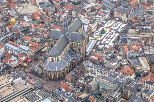 Hieronder de kathedrale basiliek Sint-Bavo aan de Leidsevaart en Westergracht. Onderaan de foto werkzaamheden aan 'Plaza West' het inmiddels qua bouw ver gevorderde winkel- en wooncentrum