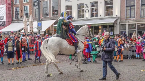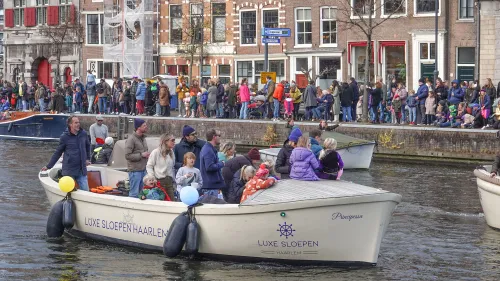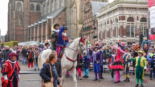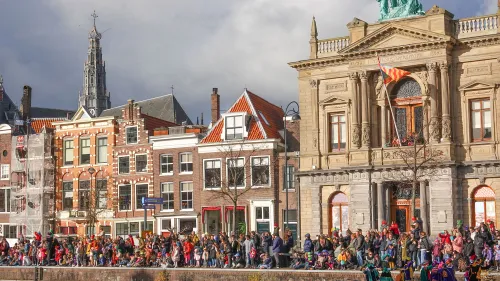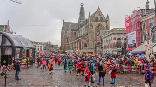 Ondanks voorspelde hagelbuien was het behoorlijk druk op de kades langs het Spaarne en ook op de Grote Markt, waar burgemeester Jos Wienen de Sint opwachtte. De Grote Markt was gevuld met honderden bezoekers. De pakjesboot met Sint en Pieten meerde aan bij de Koudenhorn, vanwaar de goedheiligman te paard richting de Grote Markt reed. Roetveeg-paardenpieten brachten de schimmel van Sint weer naar stal... Tja....'eigen paard is goud waard'