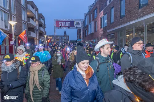 de start ontvingen wandelaars een pet met lampje, die massaal werd gedragen en