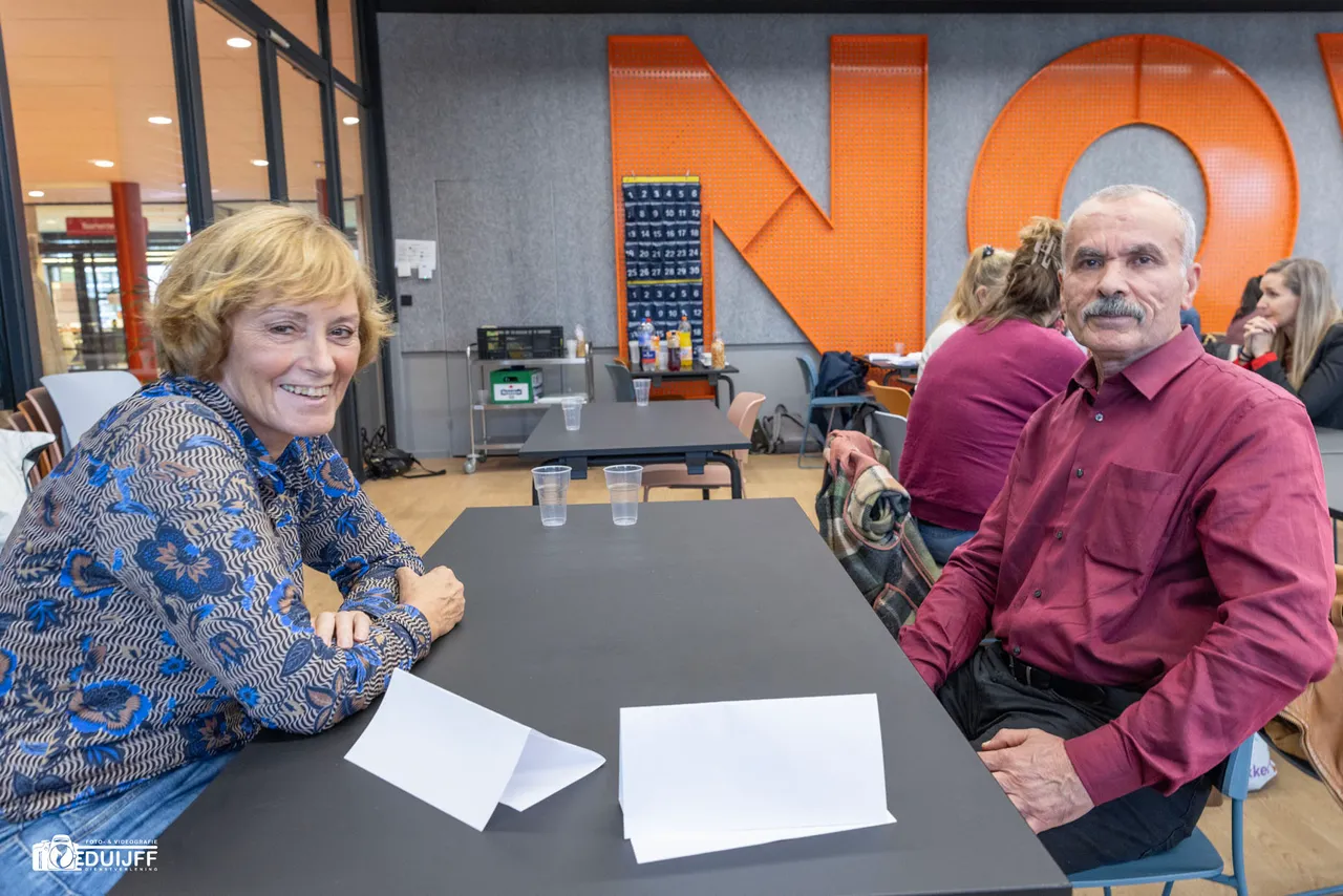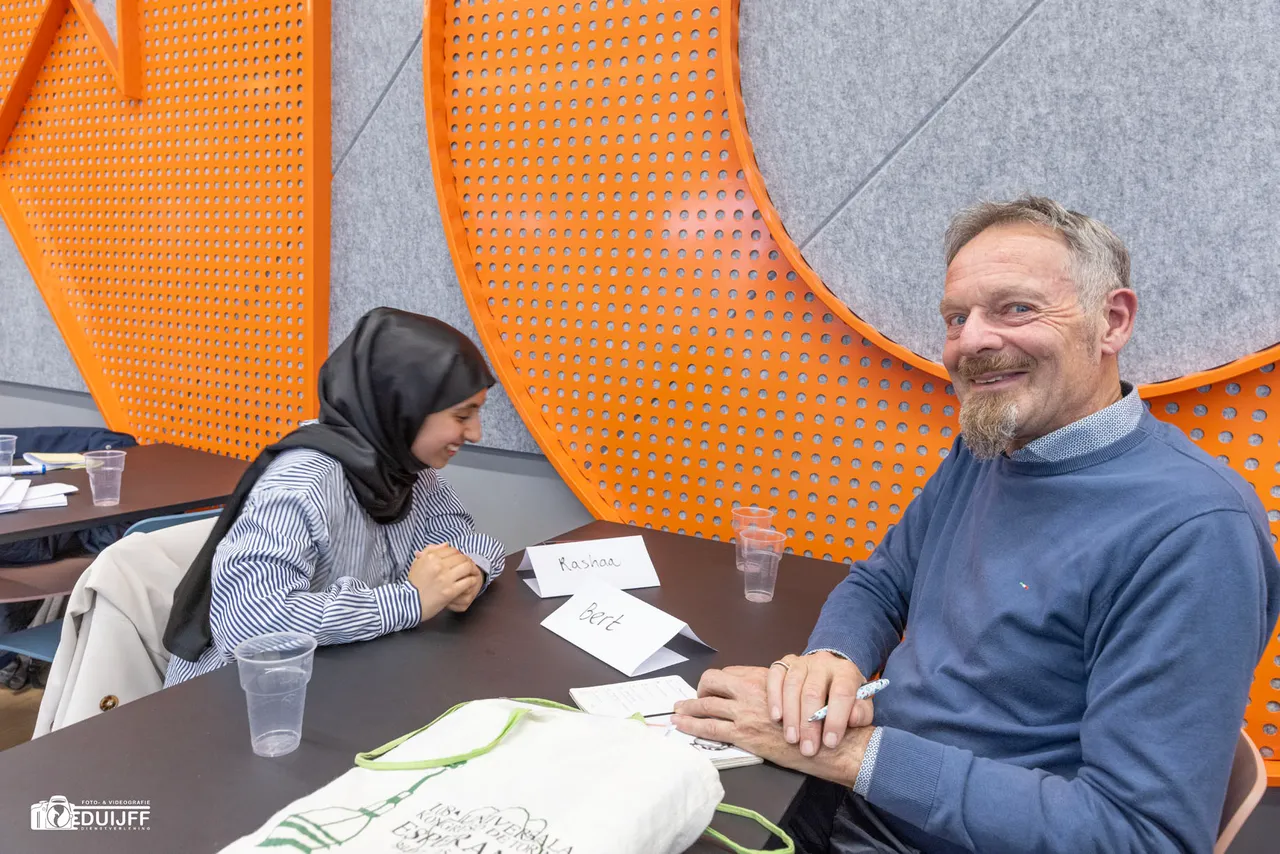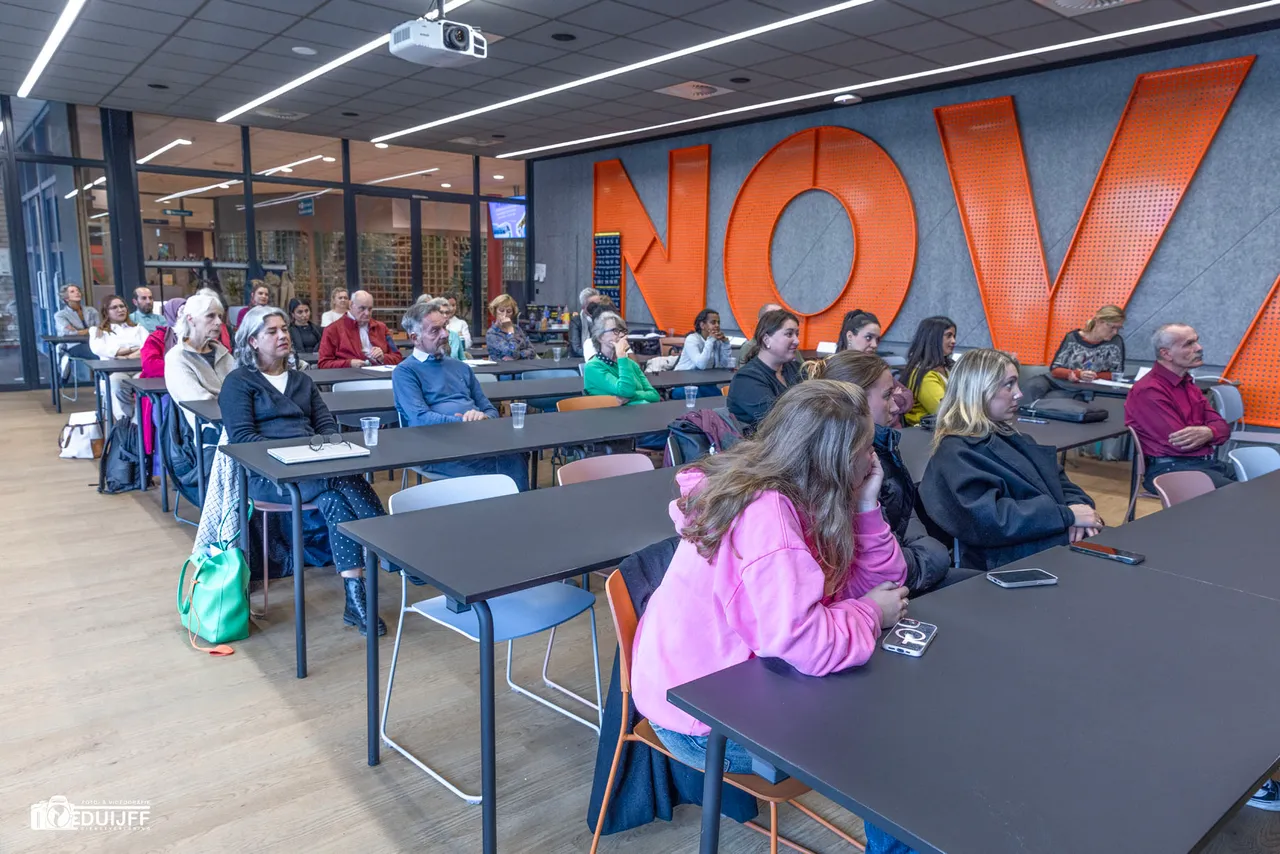 Om 17:00 uur verzamelden de aan het project deelnemende studenten en taalbuddy-vrijwilligers in een zaal van het Nova College, waar projectleider Jacco Müller iedereen welkom heette en de bijeenkomst opende. (Jacco hieronder)