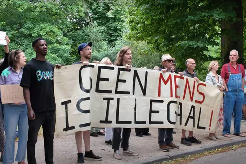 spandoeken met teksten zoals ‘Geen mens is illegaal’ en ‘Vluchtelingen zijn