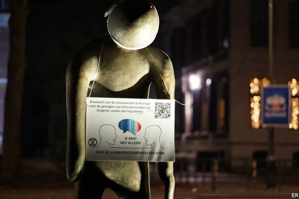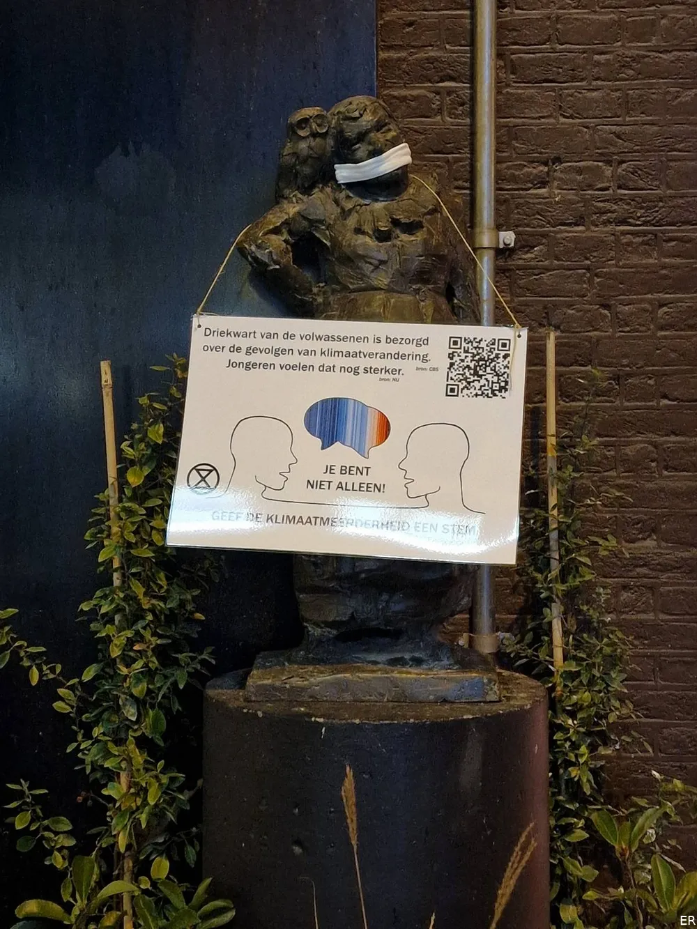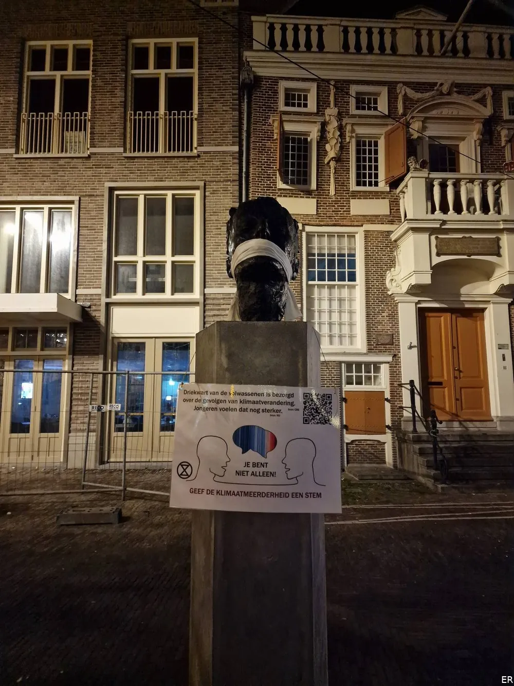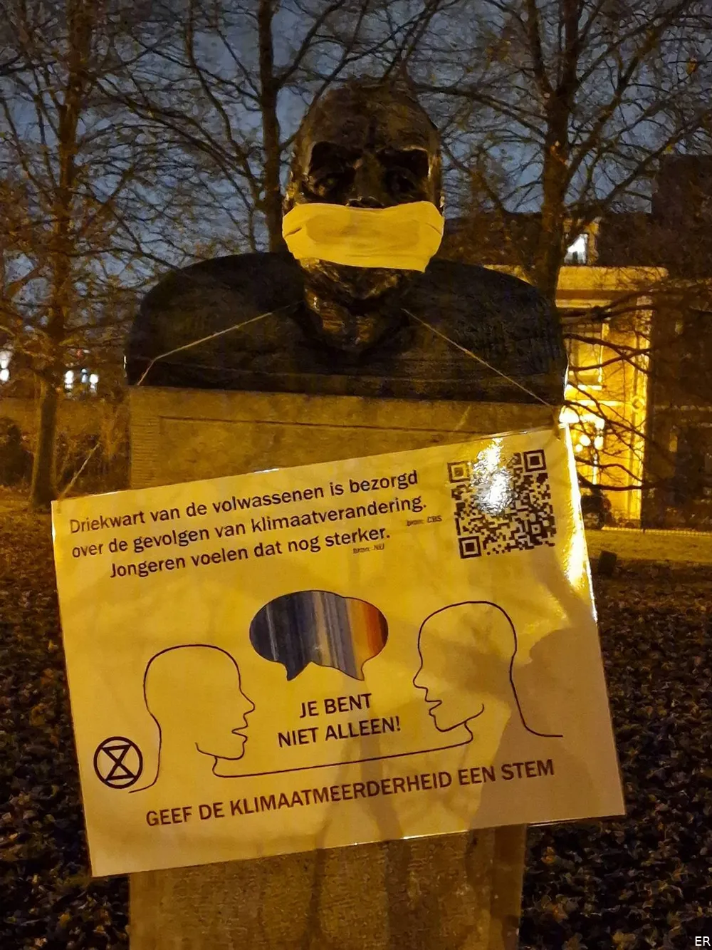 HAARLEM - In de vroege ochtend van zondag 21 oktober hebben Scientist Rebellion (SR) en Extinction Rebellion (XR) standbeelden in Haarlem stilletjes de mond gesnoerd. “Het is een visueel protest dat de zorgen en frustratie van 76 % van de Nederlandse bevolking over de klimaatcrisis samenvat en uitnodigt tot het uitspreken van deze zorgen”, aldus SR en ER.