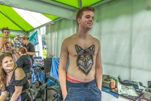 Op het festivalterrein ook een locatie waar de kunst van body-painting wordt bedreven. Alle beelden daarvan werden genomen met toestemming van de figuranten.