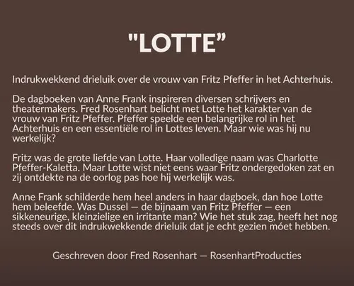 Bij het grote publiek staat Fritz Pfeffer vooral bekend als “Dussel”, de tandarts uit Het Achterhuis. In dat dagboek wordt hij neergezet als een moeilijke- en soms bekrompen man. Lotte doorbreekt dit eenzijdige beeld en toont een meer gelaagde persoonlijkheid: een liefhebbende partner en een man die, ondanks de dreiging van de oorlog, hoop en menselijkheid behoudt.