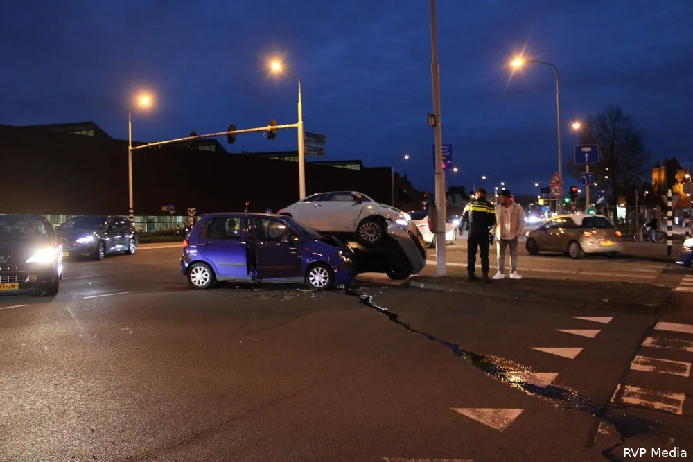 Bij de botsing kwam een van de voertuigen bovenop de andere auto tot stilstand. Hulpdiensten, waaronder de ambulancedienst, kwamen ter plaatse. Twee personen zijn voor verder onderzoek overgebracht naar het zieekenhuis.